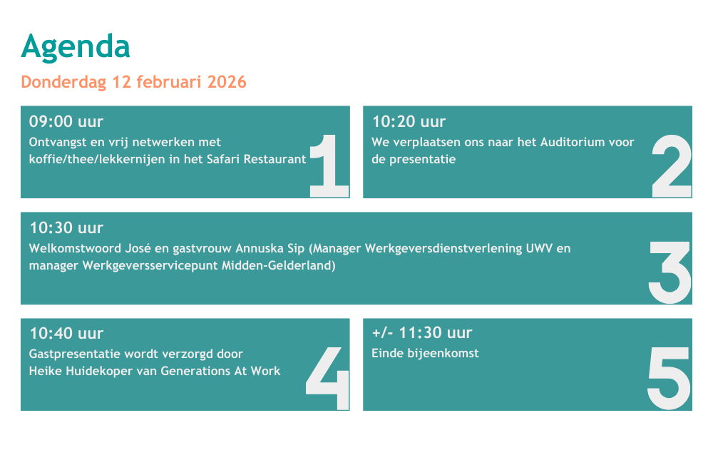 Je bent dus op donderdag 12 februari van harte welkom om met 5 verschillende generaties van 09:00 tot 11:30 uur aangenaam te komen netwerken bij hét business netwerk voor de succesvolle ondernemer in de regio Arnhem-Nijmegen tot vér daarbuiten!